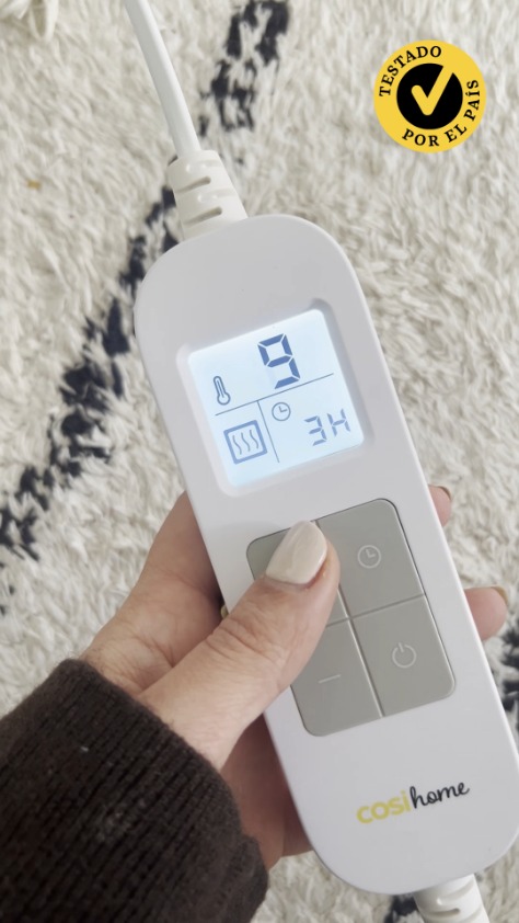 Si la calidad de los acabados de la manta eléctrica obtiene una muy buena valoración, sucede lo mismo con la calidad de su control remoto. Ha sido el que más me ha gustado y se agradece, además del tamaño de su pantalla, cómo se han distribuido sus botones de control. Uno de estos controles está identificado como “Time”: activa el temporizador de nueve horas con apagado automático que ha incluido el fabricante.