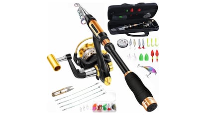 Este kit de pesca es el número uno más vendido en Amazon e incluye una caña de pescar, un carrete, numerosos anzuelos y señuelos y una bolsa de transporte con asas. La caña de pescar telescópica está fabricada en fibra de carbono de alta densidad y el carrete es giratorio e incorpora un interruptor antirretroceso de parada instantánea. La bolsa es resistente al agua y muy duradera.