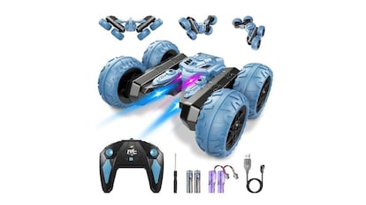 Este coche teledirigido va mucho más allá de “un simple RC”: gira 360°, hace volteretas de 180° y se mueve con luces y música que lo hacen irresistible para los niños. Su mando es fácil de usar y las dos baterías recargables incluidas aseguran varias rondas de juego sin interrupciones. Está diseñado para que se pueda usar tanto dentro como fuera de casa, y su tamaño y resistencia lo convierten en una opción entretenida para competir con amigos. Un regalo que combina velocidad, acrobacias y diversión visual de principio a fin.