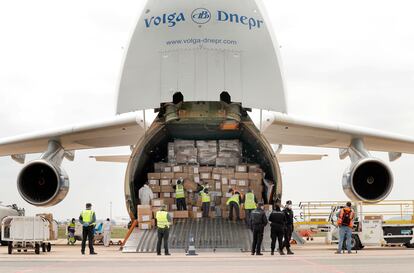 A mediodía, ha aterrizado en el aeropuerto de Manises un gran avión de carga Antonov 124 con 65 toneladas de material sanitario procedente de la ciudad china de Shenzhen, tras hacer escala en Moscú. Es el cuarto avión con material encargado por la Generalitat valenciana y el primero no compartido con otras comunidades autónomas o instituciones. El A124 de las líneas aéreas Volga-Dnepr trasportaba 506.800 mascarillas quirúrgicas, 216.860 monos de protección EPIs, 994.450 guantes y 60.000 gafas. En este envío se han priorizado los monos , según fuentes de la Generalitat. En los próximos días y semanas llegarán respiradores invasivos, los más demandados, adquiridos por el Gobierno valenciano.