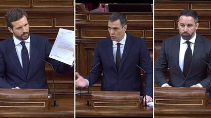 El líder de Vox, Santiago Abascal, ha rechazado también como Casado las apelaciones a la unidad y a obviar la crispación y los insultos de Sánchez, y ha arremetido de nuevo otra vez con fijación casi monográfica contra el vicepresidente segundo, Pablo Iglesias. A Sánchez le ha recriminado su máxima al levantar la voz a favor del 8-M y rebatió: “¡Gritar viva el 8-M es como gritar viva la enfermedad y la muerte!”. A Iglesias le ha recordado que fue él mismo el que presumió de su padre como militante del FRAP, para llamarle terrorista, y ha aludido incluso a su abuelo. También ha recurrido a sus clásicos ataques al Grupo Prisa, editor de EL PAÍS. Al vicepresidente le ha advertido de que acabará teniendo que rendir cuentas ante los tribunales y los españoles y le ha reprochado que se marche del hemiciclo durante sus intervenciones: “Que aproveche ahora, que ya tendrá tiempo de verlas desde una pantalla de televisión cuando esté en la cárcel”.