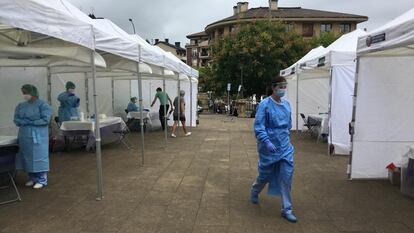 “El grado de preocupación es máximo”, admitía por la mañana Ezenarro. No se ha separado durante las primeras horas ni un segundo de la explanada donde se han instalado varias carpas en las que personal médico ha realizado este lunes pruebas PCR a las personas que han frecuentado la calle famosa por sus bares desde el pasado 27 de junio. “Ese día se reunieron cientos de personas en las tabernas, la gran mayoría sin mascarillas. La imagen fue deprimente”, afirma una vecina de la localidad. Todos aquellos que han estado en esta zona desde entonces son potenciales víctimas de contagio. Por eso, el Departamento vasco de Salud les ha llamado para pasar la prueba de detección.