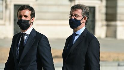 Los máximos dirigentes del Partido Popular han salido este jueves en tromba en apoyo a la Monarquía, a la que consideran objeto de ataques por una parte del Gobierno, en referencia a Unidas Podemos. “Creo que es una institución esencial, que es el símbolo de la continuidad histórica de España y por eso desde el PP defendemos a la Jefatura del Estado y a su majestad el Rey frente a los ataques de algunos ministros del propio Gobierno”, ha dicho el líder del PP, Pablo Casado, tras el homenaje a las víctimas de la covid-19 en el Palacio Real. Casado no ha ocultado a los periodistas que su propósito era enviar “un mensaje de respaldo a la Casa Real y, en concreto, al rey don Felipe VI”.