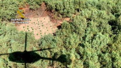 Lo que estos dos bandoleros estaban dispuestos a proteger a hasta con sangre ha quedado al descubierto este viernes, cuando la Guardia Civil de Cádiz ha compartido imágenes y vídeos de las plantaciones de marihuana que se ocultaban entre una zona de árboles y matorrales de El Tarajal, una zona rural a las afueras del pueblecito de Bornos (7.800 habitantes) y enclavada en plena Sierra de Cádiz. Los supuestos narcos aprovechaban el abundante agua del territorio, regado por un arroyo y por el cercano pantano de Bornos, para ocultar huertos dispersos de maría. Los vuelos del helicóptero del Instituto Armado hacen visibles pequeños claros en los que se aprecian las matas de cannabis, pero no eran sencillos de ver en tierra. “Hay que buscarlos para encontrarlos”, apunta un agente.