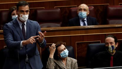 El presidente del Gobierno, Pedro Sánchez, ha respaldado este miércoles en el Congreso al vicepresidente segundo, Pablo Iglesias, cuya destitución ha vuelto a pedir el líder del PP, Pablo Casado. Sánchez ha reclamado al jefe de la oposición que cambie de estrategia y vuelva a situar a su formación como “un partido de Estado” y no "antisistema”. El Ejecutivo ha afrontado así una nueva sesión de control bronca en medio de una tormenta política centrada en los ataques desde la derecha a Iglesias, al que han llamado “machista” y sobre el que han augurado que será condenado por el Tribunal Supremo en el caso Dina, una causa en la que no está imputado. El juez Manuel García-Castellón pidió la semana pasada al Supremo que investigue a Iglesias en esta pieza del caso Villarejo que versa sobre el supuesto robo del móvil de una antigua colaboradora del líder de Unidas Podemos, al tener Iglesias la condición de aforado. El número dos del PP, Teodoro García Egea, ha vaticinado incluso que Sánchez le tendrá “que acompañar a la cárcel”.