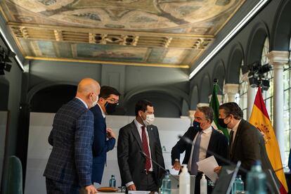 El Gobierno andaluz que preside Juan Manuel Moreno (PP) aprobará el próximo miércoles el proyecto de ley de Presupuestos de la Junta de Andalucía para 2021, sin esperar a tener el visto bueno total de Vox, su principal sostén parlamentario. El Ejecutivo de coalición de PP y Ciudadanos se tirará a la piscina porque sabe que hay agua, aunque el temor a que alguien tire del tapón del desagüe está ahí. El viraje del líder del PP, Pablo Casado, respecto al partido de Santiago Abascal visualizado en la moción de censura ―“No queremos ser como usted, porque no queremos ser como usted, el partido de la mentira y la involución”― pone en un brete a los suyos en Andalucía que, paradójicamente, deseaban un giro al centro del partido.