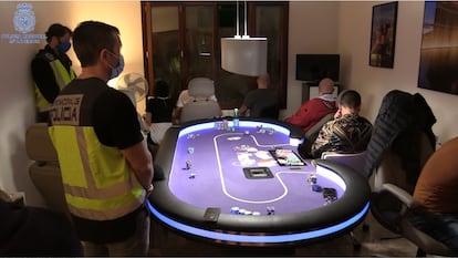 El pasado sábado por la noche en un chalet cercano al Polígono de Son Castelló de Palma una decena de personas se reunían alrededor de una mesa de cartas iluminada por reflejos azules de luces led. Los montoncitos de fichas iban y venían sobre el tapete, las apuestas subían y los jugadores escondían de los rivales su suerte en la mano de póquer. En otra parte de la estancia, una mujer desplegaba sus limas y esmaltes en una mesa de manicura mientras dos jugadores esperaban su turno para apostar junto a un pequeño quiosco con dulces y puros habanos. Los agentes de la Policía Nacional de Palma irrumpieron por sorpresa en la vivienda y desarticularon esta timba ilegal en la que los premios llegaron a alcanzar los 120.000 euros en algunas partidas.