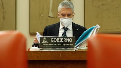 ”¿Dimitir? No lo hará mientras sepa que cuenta con el apoyo de Pedro Sánchez”. Quienes conocen a Fernando Grande-Marlaska (Bilbao, 58 años) están convencidos de que, tras cerca de tres años al frente del Ministerio del Interior, no va a tirar la toalla pese a que las dos últimas polémicas hayan afectado al que, como juez, es su flanco fuerte: el jurídico. Su defensa de la actuación en la que seis policías derribaron sin orden judicial la puerta de un piso en Madrid en el que se celebraba una fiesta ilegal y la sentencia de la Audiencia Nacional que obliga a su departamento a restituir como jefe de la Guardia Civil en Madrid al coronel Diego Pérez de los Cobos han provocado una marejada política aprovechada por la oposición para pedir su dimisión, pero también un “desgaste personal importante”, admiten en el PSOE. “Él está muy tranquilo, porque sabe que le asiste la razón jurídica y política”, insisten en su equipo.