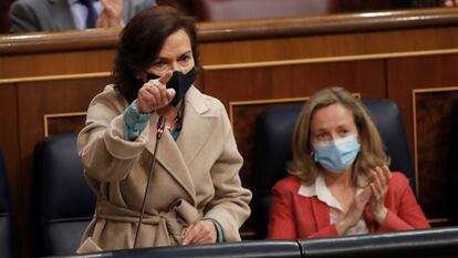 El Gobierno y el PP se han enzarzado este miércoles de nuevo sobre el funcionamiento y la renovación pendiente de órganos institucionales clave como el Consejo de Estado y el Consejo General del Poder Judicial. El PP ha comenzado el duelo en la sesión de control del Congreso recriminando al Ejecutivo que no respete los informes de su principal órgano consultivo para imponer sus “cacicadas”, como la polémica reciente sobre el método de reparto de los millonarios fondos europeos, y se apropie del “correctivo” impuesto por Bruselas para “intervenir la justicia española” ante los intentos de modificar el método de elección del Poder Judicial. La vicepresidenta Carmen Calvo ha reprochado al PP sus intromisiones pasadas y su reciente bloqueo en el Poder Judicial y ha avisado de que el Ejecutivo también podría viajar por Europa para denunciar que los populares no asumen la legitimidad de Gabinete actual salido de las urnas.