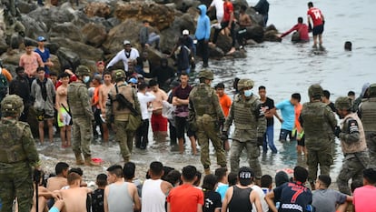Varias unidades del Ejército de Tierra se han desplegado en la madrugada del martes en Ceuta para ayudar en las labores de control de las calles de la ciudad tras la entrada de más de 8.000 inmigrantes, la mayoría marroquíes, por los espigones fronterizos. La llegada de personas a nado y a pie fue constante durante todo el lunes y continúa este martes en la misma playa donde se han desplegado blindados. En las últimas 24 horas, miles de jóvenes, pero también familias enteras, se han lanzado al mar ante la pasividad de las autoridades marroquíes. Un hombre murió en el intento.