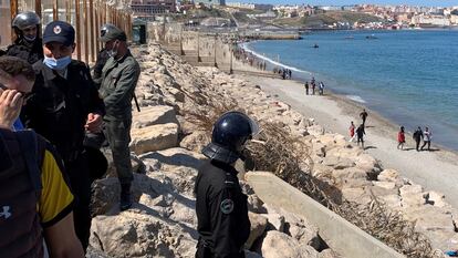 Una valla de metal protegida por policías marroquíes impide el acceso por carretera a la frontera con Ceuta, a un kilómetro de distancia. “Esta valla ayer [este lunes] no estaba”, comentaba un joven marroquí. “Se podía llegar hasta el espigón. Y desde allí solo se tardaba diez minutos en llegar a Ceuta a nado. El problema es que había que nadar porque los policías marroquíes no nos dejaban pisar la tierra, decían que solo podíamos meternos en el agua”, ha señalado.