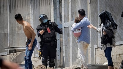 Ganga, de Costa de Marfil, ha trabajado cinco años en Tánger, pero no veía cómo mantener a su familia con un sueldo de peón de obra. “Yo trabajaba en el puerto en Costa de Marfil”, cuenta, “vine a Marruecos para trabajar como cualificado en logística portuaria, pero acabé destrozándome las manos como albañil”. Él, su esposa y sus tres hijos de cuatro, dos y un año cogieron el lunes un taxi desde Tánger rumbo a Fnideq y se lanzaron al mar a las cinco de la tarde. Un día después merodea por el polígono del Tarajal, donde el Ejecutivo local y la Delegación del Gobierno han habilitado varias naves para acoger a menores y mujeres, considerados vulnerables y, por tanto, no sujetos a las devoluciones exprés que el Gobierno de España ha realizado desde el lunes por la tarde. “Allí (en Marruecos) no puedo mantener a la familia”, dice, “quiero pedir asilo para trabajar aquí en condiciones y cubrir sus necesidades”.