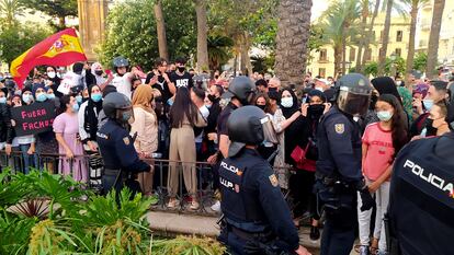 La tensión en Ceuta, donde este lunes se ha cumplido una semana del inicio de la crisis migratoria, ha ido en aumento a lo largo de la jornada, azuzada por el partido ultra y el propio Abascal. Pese al dictamen judicial que le impedía celebrar el mitin, Vox ha mantenido la convocatoria hasta apenas dos horas antes de que se celebrase. Ha sido entonces cuando el presidente de la formación ha anunciado que la cambiaba por unas declaraciones sin preguntas a los medios de comunicación a las puertas del Parador de Ceuta, donde se encuentra alojado. Pero, finalmente, tampoco ha comparecido, por la presencia de cientos de personas que le han instado a irse “fuera de Ceuta” en medio de un importante despliegue de efectivos de la Policía.