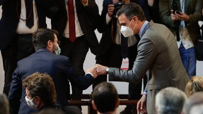 La “autocrítica” de Junqueras, según José Luis Ábalos, y su “revisión” de cómo actuó el independentismo en 2017 fue recibida con alivio en La Moncloa. Y fue el preludio del acto de la patronal catalana en el que se apreció la sintonía entre Pedro Sánchez y Pere Aragonès, que el viernes ya abordaron por teléfono una cita este mes y la reactivación de la mesa de diálogo antes del verano. “Pedíamos que en Cataluña hubiera voces, que en su momento defendieron el independentismo de forma unilateral, que se dirigieran con el valor necesario a sus votantes y plantearan la realidad con sinceridad y pragmatismo”, dijo Ábalos en La Sexta.