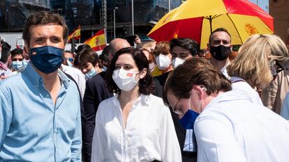 En sentido literal y metafórico, Pablo Casado se ha quedado este domingo en la periferia de la plaza de Colón. El líder del PP no llegó a hacer entrada en la plaza madrileña y se quedó en la confluencia de la calle Génova con el paseo de Recoletos, en consonancia con el perfil bajo que buscaba en una protesta que desde el principio habría querido evitar. Casado esquivó la foto con Vox, sin cruzarse en ningún momento con Santiago Abascal, pero no pudo evitar que Isabel Díaz Ayuso, que le acompañó en su recorrido, le robara parte del protagonismo. Tanto por los constantes vítores y alabanzas que los simpatizantes le dedicaron a la presidenta madrileña ―”¡Ayuso, tú puedes sola con Sánchez! ¡Preséntate!”―, como porque Ayuso lanzó la declaración más explosiva involucrando al Rey en los indultos a los líderes del procés: “¿Qué va a hacer, va a firmar esos indultos?”, inquirió a Felipe VI.