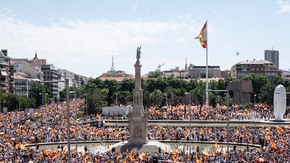 Bajo el enérgico sol del mediodía, el himno de España sonaba incesante, solo interrumpido por esporádicas incursiones de corneta, y el centro de la plaza de Colón distaba de estar abarrotado. Faltaban unos minutos para las 12, hora prevista para el inicio de la concentración, y la gente hacía ondear las miles de banderas rojigualdas o enarbolaba sus pancartas, con Pedro Sánchez como objetivo predilecto. Una le llamaba “asesino, ególatra y globalista”. Otra hacía descansar su foto sobre una sucesión de emoticonos de excrementos. Más incluso que protestar contra los indultos, lo que pedían los gritos y las consignas con insistencia era la dimisión del presidente del Gobierno.