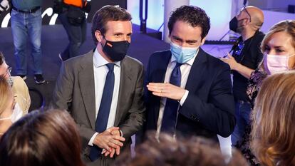 La resaca de Colón sigue enredando al PP. Los populares preferían pasar página cuanto antes de la manifestación del domingo contra los indultos, que no ha dejado de dar al partido dolores de cabeza, y por eso habían preparado este lunes —solo 24 horas después— el acto de presentación de la convención nacional del partido del próximo octubre. Se trataba de cambiar el paso rápido y mirar hacia delante. Pero el plan no salió como se esperaba, porque el correctivo de Pablo Casado a Isabel Díaz Ayuso por sus palabras el domingo acerca del papel del Rey en los indultos terminó por eclipsar el acto. El líder del PP corrigió a la presidenta madrileña desvinculando a Felipe VI de la medida de gracia y subrayando que en ningún caso el monarca puede ser cómplice por firmar la iniciativa, porque ese es su papel constitucional. A media tarde, Ayuso matizó sus palabras y reconoció que “por supuesto que el Rey no es cómplice de nada”.