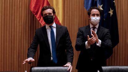 El líder del PP destacó mucho su presencia este lunes en el Parlamento, “donde debemos”, frente a la comparecencia de Sánchez en el Liceu de Barcelona ante la llamada sociedad civil catalana. Y aprovechó esa escenografía para relacionar la asistencia de algunos miembros y colectivos de Cataluña “sin principios” al acto con el presidente a cambio de prebendas y hasta de dinero de los fondos de reconstrucción europeos cuyo mérito se atribuyó para su partido. “Ningún lobby logrará apartarnos del camino”, señaló Casado. A continuación, incidió en que será invulnerable a “cualquier presión”. Un mensaje que lleva lanzando desde que la semana pasada visitó Barcelona y varios responsables empresariales y hasta los obispos catalanes le dejaron bastante claro que los indultos concedidos este martes por el Consejo de Ministros podrían convertirse en un bálsamo para restañar las heridas abiertas. Casado no cree en esa solución. Al contrario.