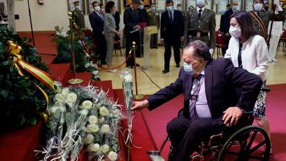 Francisco Cardona, padre de uno de los fallecidos en el Yak-42, deposita una rosa en el monolito a los caídos acompañado por la ministra de Defensa, Margarita Robles. En vídeo, las imágenes del acto. Vídeo: MARISCAL / EFE / epv