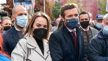 Casado se ha pronunciado sobre la sentencia del Supremo desde la protesta policial contra la derogación de la ley mordaza en Madrid, en la que ha coincidido con el líder de Vox, Santiago Abascal, y dirigentes de Ciudadanos. El líder del PP ha avisado de que irá al Constitucional contra la derogación de la ley y si llega al poder retrotraerá la reforma “que solo beneficia a los socios radicales de este Gobierno”. Casado y Abascal han coincidido en el mismo diagnóstico sobre las motivaciones de la izquierda para derogar la norma. Ambos creen que lo hace en previsión de cuando llegue a la oposición, para protestar en la calle. “Quizá están preparándose ya para la oposición, para las algaradas en la calle”, ha aventurado el líder popular. “Para poder incendiarlas a través de sus esbirros con total impunidad”, ha apostillado el líder de la extrema derecha.