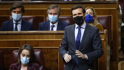 Pablo Casado dijo “coño”, en los escaños del grupo popular brotaron gritos de “¡bravo, muy bien!”, todos sus diputados se pusieron de inmediato en pie y estallaron en una enorme ovación. “¿Qué coño tiene que pasar para que usted asuma alguna responsabilidad?”, ha espetado el líder del PP al presidente del Gobierno este miércoles durante la sesión de control parlamentario al Ejecutivo. Casado remedaba así una frase que Pedro Sánchez, cuando estaba en la oposición, había dirigido al entonces presidente, Mariano Rajoy. El líder del PP ha culminado de ese modo, entre el entusiasmo de los suyos, una intervención parlamentaria en la que ha amenazado con llevar al Gobierno a los tribunales tanto por la gestión de la pandemia como por las resistencias de la Generalitat a cumplir la sentencia que obliga a impartir en los colegios catalanes un 25% de las asignaturas en castellano. Sánchez ha asegurado que su Gobierno exigirá cumplir el fallo judicial, aunque sin especificar cómo.