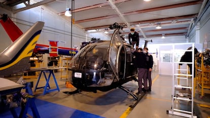 No ha pasado ni un mes desde que Samy puso fin a sus viajes de hachís y kebabs y ya uno de los tres helicópteros que usaba su banda, un Alouette II negro —diseñado con fines militares de mediados del siglo XX y valorado en más de 150.000 euros—, está en el patio del Instituto Tecnológico Superior ADA-ITS de Sevilla, empleado en un fin bien distinto. Casi una decena de alumnos de aeronáutica de ciclos formativos de grado superior y bachillerato revisan la aeronave en una fría mañana de enero, bajo la atenta mirada del instructor José Antonio Rodríguez. Media hora después, el profesor desprecinta el último remolque que les ha llegado de la Guardia Civil. Dentro, otro Alouette II —este, rojo— aún está enganchado a un ingenioso sistema de motor alimentado por energía solar que hacía posible a los narcos desplegar la máquina con rapidez en cualquier lugar.