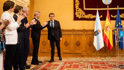 “La estabilidad fue la materia prima esencial” de su Gobierno para afrontar las crisis y la pandemia, ha defendido Feijóo antes de advertir sobre el “retorno a épocas funestas” o las “rupturas traumáticas con la legalidad”, en alusión a las alternativas políticas. “De Galicia aprendí que gobernar consiste en dialogar” ha afirmado también, visiblemente emocionado, “ser distintos no implica ser hostiles a nadie, ni establecer fronteras ni trincheras”. El hasta ahora jefe del Ejecutivo gallego ha terminado recordando que la comunidad sigue siendo “parte fundamental de su camino” y se ha despedido con su último lema electoral, el que lo llevó a su cuarto mandato: “Galicia, Galicia, Galicia”, aunque ha sustituido el tramo final de la frase “...y por cuarta vez Galicia” por el de “...y por siempre Galicia”.