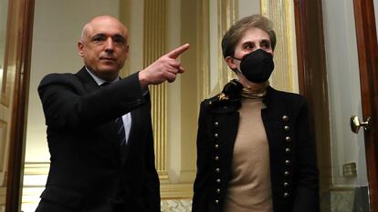 Con mascarilla negra y acompañada de Rafael Simancas, secretario de Estado de Relaciones con las Cortes, Paz Esteban López (Madrid, 63 años) subió este jueves al primer piso del palacio de la Carrera de San Jerónimo, donde se reunía a puerta cerrada la Comisión de Secretos Oficiales. Nunca antes había comparecido en el Congreso y nunca había tenido que enfrentarse a la nube de cámaras y fotógrafos que le esperaba al final de la escalera. Durante más de tres horas compareció ante los portavoces parlamentarios (incluidos los independentistas), sin exteriorizar ni un atisbo de nervios o incomodidad. La jefa de los espías españoles se mostró en todo momento serena. Sus explicaciones convencieron al PSOE y a los partidos de la derecha (PP, Ciudadanos y Vox) y dejaron más intranquilos que antes a Unidas Podemos y los nacionalistas. Pero nadie pidió su dimisión y algunos, como Edmundo Bal, le dieron su apoyo expreso. La noticia bomba no salió de sus labios. Estaba en las carpetas a disposición de cada uno de los diez diputados: copias de los mandamientos judiciales de 18 intervenciones telefónicas, incluida la del actual presidente de la Generalitat, Pere Aragonès.
