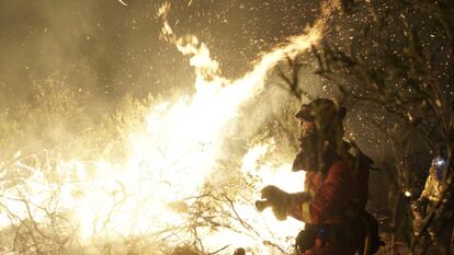 Mientras los especialistas trabajan con sus mangueras y sus cortafuegos, los extremeños y salmantinos esperan noticias con resignación. Martín Martín, de 68 años, conversa con los guardias civiles que impiden el acceso a Aceitunilla. Este bombero jubilado mira al monte, donde se aprecian amplias áreas negras e incipientes volutas de humo gris que se olfatea en función de la dirección del viento. “El fuego está a un kilómetro, pero creemos que no va a venir por la dirección del viento”, vaticina este viejo soldado contra el fuego. La sequía y los más de 42 grados de estos días, con noches que no refrescan los suelos, y bosques con muchos matorrales descontrolados propician según sus palabras que estos episodios se acrecienten. El temor principal viene de los ganaderos con el pasto de sus animales en riesgo, aunque de momento no constan daños materiales ni personales. Los negocios que viven de los parajes naturales de Las Hurdes aguardan noticias con tensión, como Janet Aznar, de 25 años, que ha acudido a los guardias para saber novedades sobre el incendio que provoca miedo en los usuarios del camping que regenta su familia: “¿Qué tal todo por ahí arriba?”.