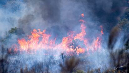 Unos agentes de la Guardia Civil cortan la nacional. “Vamos a ciegas”, confiesa el agente. Una furgoneta se acerca al área de servicio. Dentro del viejo vehículo, sujetando el volante teñido de polvo terrenoso, está Marcelino Ávila, que trae garrafas de agua para abastecer a los equipos que luchan contra el incendio. El extremeño viene del pueblo de Deleitosa, a ocho kilómetros de aquí. “Ya vine ayer y he vuelto hoy”, dice apenado, aunque con la esperanza en sus ojos —ahora rojos por la humareda gris que cubre el cielo— de no tener que hacerlo de nuevo mañana.