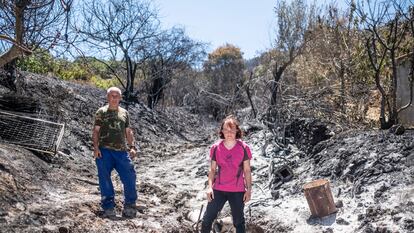 Con un paño amarillo, que antes moja en un cubo con agua, María Teresa Ibarra, de 53 años, levanta los vasos de los comensales dispuestos en la mesa para quitar el polvo negro. “¡Mira, mira! Y eso que lo he limpiado esta mañana”, refunfuña la empleada. Ibarra se mueve de aquí para allá dentro de la cocina. Las bandejas de pinchos que preparó hace una semana se han echado a perder. Mientras pela las patatas para hacer una ensaladilla, señala las zanahorias podridas que también tendrá que tirar a la basura. A la madrileña, afincada aquí desde que era niña, se le pone la piel de gallina al recordar el momento en el que el monte empezó a arder: “Me fui con lo puesto. Sentía muchas ganas de llorar e impotencia por ver toda mi vida destruida”. Aunque ya ha vuelto a acostarse en su cama, la noche se ha hecho eterna. “Voy grogui”, comenta nerviosa, después de haber tardado más de una hora en limpiar las paredes cubiertas de ceniza en su patio a manguerazos, sin apenas haber dormido.