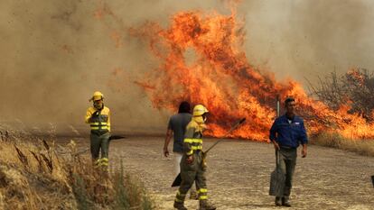 Lo mismo ocurrió el 18 de julio con una segadora de alfalfa en Palenzuela (15 hectáreas) o al día siguiente en Saldaña con una cosechadora (19), ambas localidades de Palencia; o en los de Driebes y Budía (Guadalajara), que se llevaron 550 hectáreas en conjunto, el primero por el uso de maquinaria y el segundo, por una cosechadora. El “uso de maquinaria agrícola” está tras el fuego de Humanes de Mohernando (Guadalajara), de 1.800 hectáreas, desatado el 26 de julio, según el Gobierno de Castilla-La Mancha.