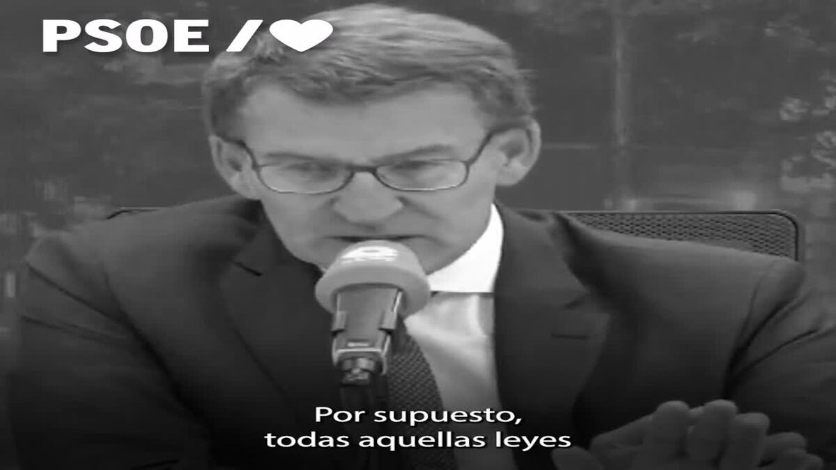 El PSOE ha lanzado una campaña en vídeo contra Alberto Núñez Feijóo, en la que presenta al líder del PP como un dirigente opuesto a todas las leyes sociales aprobadas por el Gobierno, que insiste en que está volcado paliar los efectos de la crisis sobre las clases medias y trabajadoras. El partido de Pedro Sánchez ha recogido en el vídeo la entrevista que el expresidente de la Xunta dio este lunes en la cadena eclesiástica Cope, donde anunció que, si llega al poder, derogará todas las leyes que los populares han recurrido ante el Tribunal Constitucional. “Hoy Feijóo ha prometido hacernos retroceder 40 años”, se dice en la campaña socialista, que incluye en el listado leyes que el presidente del PP no cito ante Carlos Herrera. El propio Sánchez, durante la reunión en el Congreso de los parlamentarios en Cortes y en Europa del PSOE, afirmó: “El único proyecto político del PP es derogar todos los avances logrados por España en esta legislatura. Por eso votan siempre en contra de todo”.