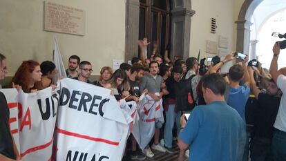 A las ocho, entre gritos de “fuera fascistas de la Universidad”, Olona ha entrado en la facultad escoltada por una decena de policías y, tras varios intentos infructuosos, finalmente ha conseguido acceder al paraninfo, con capacidad para unos 200 asistentes, pasados seis minutos de las ocho de la tarde. A las puertas se han quedado numerosos partidarios, que no han podido entrar.