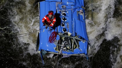 La primera llamada de alerta fue la de un usuario de la carretera que, a pesar de la oscuridad y el fuerte temporal de lluvia que el sábado no daba tregua, se fijó en que la barrera de la N-541, que une Lugo y Pontevedra, estaba reventada, a una altura de 29 metros sobre el cauce del desbordado río Lérez. La siguiente llamada al 112, muy poco después, procedía del interior del propio vehículo que había caído al agua: un autobús del grupo lucense Monbus, la mayor empresa española de transporte de viajeros por carretera y que controla gran parte de las líneas en Galicia. Eran alrededor de las 21.20 de Nochebuena, y la mujer describía al servicio de emergencias que la cabina del autocar se estaba “llenando de agua”.