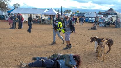 Cerca del mediodía de este martes, unas 200 personas bailaban techno junto a unos grandes altavoces presididos por una gran botella que expulsaba fuego con la palabra Repression. A pocos metros, otro centenar hacía lo propio en un escenario con una gran calavera. Desde una cabina con forma de coche policial en llamas, un DJ animaba a los participantes a seguir la fiesta con una versión electrónica de Macarena. Había jóvenes disfrazados, chicas con rastas, chicos con el pelo de colores y mucha estética punk. Las gafas de sol eran la norma, como la energía infinita. En una mesa, un joven vendía jabones hechos con albahaca o cerveza. Bajo una carpa, varias personas ofrecían piadinas, panzerotti (empanadas fritas) y otros bocados italianos por precios que oscilaban entre los tres y los seis euros. A doce se vendían las camisetas y los zumos costaban un euro. En una olla hervía un potaje y en una plancha había hamburguesas y salchichas. En un horno fabricado con barro y paja del propio entorno alguien cocinaba pizzas que se vendían a seis euros. Hay quien descansa en sus tiendas de campaña, bebe una cerveza en el suelo o juega con sus perros. Para ir al baño valía un pinar cercano. Junto a una barra de bebidas, un mensaje alertaba a los participantes: “Pastilla rosa con cara sonriente vendida como MDMA o éxtasis: no contiene nada. ¡No consumir!”.
