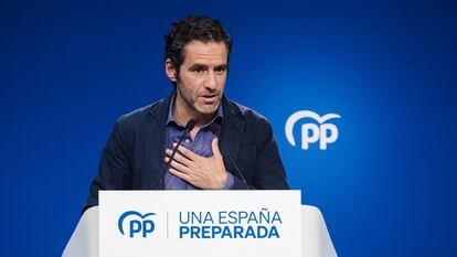 El concejal electo y jefe de lista del PP a la alcaldía de Barcelona, Daniel Sirera, en una rueda de prensa la semana pasada. / PP