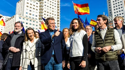 Las alusiones al terrorismo se han repetido tanto durante el discurso de Feijóo como durante el turno de palabra de la presidenta de la Comunidad de Madrid, Isabel Díaz Ayuso, y del alcalde de la capital, José Luis Martínez-Almeida. “Quieren confundir terrorismo con vandalismo. Criminalizan la vida normal y normalizan el crimen porque pactan con el crimen”, ha incidido la dirigente madrileña. Casi todos los barones del PP han acudido a la protesta junto a los miembros del comité de dirección. También los expresidentes José María Aznar y Mariano Rajoy, a quienes Feijóo ha agradecido especialmente su asistencia. A diferencia de actos anteriores, Vox no ha apoyado en esta ocasión la concentración. La mayoría de los manifestantes, que copaban tanto la plaza de España como las calles aledañas, portaban banderas de España y del Partido Popular Europeo.