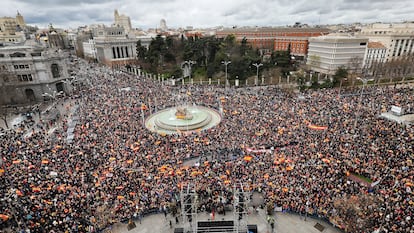 En la recta final de la tramitación parlamentaria de la Ley de Amnistía, la protesta en la calle ha perdido fuelle este sábado. Sea por el tiempo desapacible en Madrid (intenso frío y lluvia intermitente) o por cansancio, la concentración en la céntrica plaza de Cibeles no ha tenido el éxito de sus precedentes, las del 21 de enero y el 18 de noviembre. Si entonces asistieron 31.000 y 170.0000 personas respectivamente, según la Delegación del Gobierno, esta vez la cifra se ha quedado en 15.000, según la misma fuente.