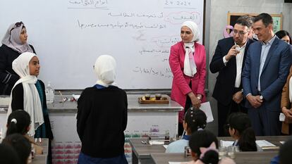 En la escuela de las niñas refugiadas palestinas, Natalie Boucly, comisionada general adjunta de UNRWA, ha agradecido a Sánchez especialmente el apoyo en un momento de críticas fuertes a la organización por parte de Israel y algunos de sus países aliados. “El apoyo político de España y su activo rol para mantener el apoyo de la UE a UNRWA es fundamental frente a los ataques que buscan menoscabar la vida de los refugiados palestinos. Gracias al apoyo de España, podremos mantener las actividades hasta junio”, ha asegurado Boucly. Sánchez ha encontrado en la escuela de niñas, con las que ha podido charlar un rato, un gran respaldo a la posición española, que se está destacando dentro de la UE como la más próxima a los palestinos y a la UNRWA. De hecho, el presidente ya apuntó la víspera, en una conversación informal con los periodistas, que el reconocimiento de Palestina por parte de España llegará “este semestre”, antes del verano, y confía en que hagan lo mismo otros países europeos.