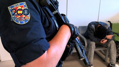 Yousef Mohamed Lehrech, alias El Pastilla, el presunto sicario de 20 años que se fugó de la prisión madrileña de Alcalá-Meco el pasado 23 diciembre y que fue detenido un mes y dos días después en Alemania, ya está en España. Agentes de la División de Cooperación Internacional de la Policía Nacional lo han trasladado este miércoles desde el país europeo a Madrid en un vuelo que aterrizaba sobre las tres de la tarde en el Aeropuerto Adolfo Suárez-Barajas procedente de Fráncfort. Las imágenes difundidas por el Ministerio del Interior muestran el fuerte dispositivo de seguridad desplegado a su llegada. La fuga de El Pastilla del Centro Penitenciario Madrid II, en Alcalá Meco, se produjo la víspera del día de la pasada Nochebuena tras concurrir, al menos, cuatro graves fallos de seguridad que desembocaron en que el recluso pudiera salir de la prisión caminando tranquilamente por la puerta principal.