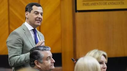“No voy a participar en la cacería del inmigrante”. Con esta frase, el presidente de la Junta de Andalucía, Juan Manuel Moreno (PP), se ha empleado a fondo este jueves en rebatir los infectos argumentos de Vox en el Parlamento andaluz contra la “inmigración ilegal” — “todos son varones y magrebíes, ¿dónde están los niños? Tiene más cuerpo y barba que usted y yo”—, aunque también ha marcado distancias con el discurso que exhibió el líder del PP, Alberto Núñez Feijóo, el pasado lunes. En una reunión de la Junta Directiva Nacional del PP (a la que Moreno no asistió), Feijóo se arrimó a la tesis de la extrema derecha equiparando inmigración y delincuencia. “Solidaridad sí, pero seguridad también. Para los que llegan, pero también para los que estamos. Los españoles tienen derecho a salir tranquilamente a la calle”, dijo el presidente popular.