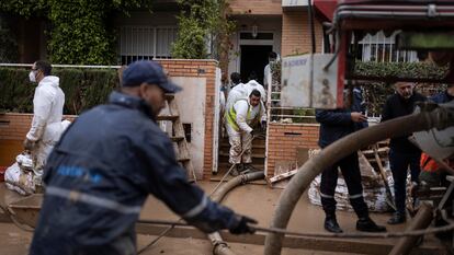 La cuadrilla de Drief Elkramar no conoce la pausa. Su camión cuba ha recorrido casi 800 kilómetros desde Tánger (Marruecos), pasando por el puerto de Motril, para que los vecinos de la calle Cruz Roja de Alfafar puedan respirar con alivio. Elkramar, de 49 años, no habla una sola palabra en español, pero no es necesario para que el trabajo de limpieza de alcantarillas fluya sin descanso. Uno de sus compañeros introduce una manguera negra de una pulgada y media de ancho en el patio de la casa nueve e inyecta agua a presión. “El chorro podría perforarte una pierna”, explica Abselam Abbel-lah, quien trabaja en Protección Civil en Ceuta y quien durante la jornada sirve de traductor para el contingente marroquí especializado en desatascar sistemas de drenaje.