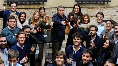 La primera imagen de Alberto Núñez Feijóo de este sábado fue la del líder del PP brindando con una Mahou 0,0 con cargos locales y jóvenes en Valladolid. La capital de Castilla y León acoge este fin de semana la XXVII Intermunicipal del Partido Popular, que este año ha revestido un perfil bajo, con todo el protagonismo sobre los alcaldes de la formación, sin apenas barones y con la mirada puesta en Sevilla, donde el PSOE celebra su 41º Congreso federal —“congreso de los imputados”, clamó la secretaria general del PP, Cuca Gamarra, en la apertura del acto—. La foto con una cerveza sin de Feijóo, que se unió a los 2.000 asistentes ya por la tarde, estaba cuidadosamente buscada para mostrar la “tranquilidad” que su equipo intenta trasladar tras la “cascada” de “escándalos” del Partido Socialista. “Esto está aburridísimo”, reconocía sobre el transcurso de la convención un miembro de la dirección.