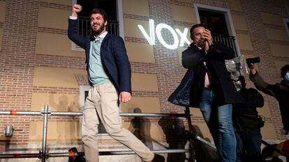 El candidato de Vox a la presidencia de Castilla y León, Juan García-Gallardo (izquierda), y el presidente de Vox, Santiago Abascal, en la noche electoral autonómica del 13 de febrero de 2022, en Valladolid.Foto: PHOTOGENIC/CLAUDIA ALBA (EUROPA PRESS) | Vídeo: EPV