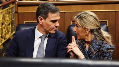 El pulso sigue, pero las formas cambian. Después de una jornada inédita en la coalición progresista en la que los dos sectores discutieron abiertamente y en directo en una rueda de prensa sobre la decisión de Hacienda de que los perceptores del salario mínimo tributen por primera vez en el IRPF, este miércoles el tono y las imágenes cambiaron por completo. Una de las principales protagonistas de esta batalla interna, María Jesús Montero, vicepresidenta primera, alegó una gripe para no acudir al Congreso, y eso hizo que Pedro Sánchez y Yolanda Díaz, vicepresidenta segunda, se sentaran juntos en la sesión de control. Ambos se esforzaron por ofrecer una imagen de la coalición muy diferente a la del día anterior en La Moncloa: se hicieron gestos cómplices, ella aplaudió sus choques con Alberto Núñez Feijóo y sonrieron. El presidente, a la salida, negó que hubiera una crisis en la coalición: “En absoluto”, contestó. En público, aunque las posiciones de fondo no han cambiado y la discrepancia sigue, se cuidaron los gestos y las palabras.