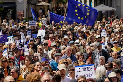 Los concentrados portaban pancartas “contra el genocidio en Palestina” y otras que rezaban: “UE: Unidos o sometidos”. Francisco Cánovas, de 75 años, acompañaba a su sobrina, Sofía, asesora de Naciones Unidas en Ucrania para asuntos de derechos humanos y de género. “Es un momento crucial. Llevo dos años allí, volví hace una semana y la situación está peor que nunca. Por eso estoy aquí”. Gemma Núñez, responsable de estrategia de Jóvenes Europeos Federalistas de Madrid, compartía su preocupación por cómo jóvenes de su edad compran el discurso antieuropeísta de la extrema derecha: “Es muy importante concienciar sobre los valores que defiende la Unión Europea y entender que los derechos que disfrutamos no están garantizados”. Fermín, de 22 años, tampoco quiso perderse la concentración: “Estoy aquí porque ahora más que nunca hace falta salir a las calles para defender Europa. Nos encontramos en un clima internacional sin precedentes desde la Segunda Guerra Mundial y debemos unirnos para preservar nuestros valores y estilo de vida. Creo que mucha gente que se define como euroescéptica, en realidad es eurocrítica, que es una manera muy fuerte de ser europeísta. Tenemos que seguir construyendo Europa a través de la crítica constructiva”. La reciente encuesta del instituto 40dB. para EL PAÍS y la Cadena SER sobre “los retos de la Unión Europea” mostró que los españoles conservan un alto grado de europeísmo ―en una escala de 0 a 10, siendo 10 “totalmente europeísta”, la población se sitúa, de media, en el 7,4―, pero al tiempo, el 55,8% de los españoles perciben que la UE actúa “poco o nada unida” y el 58,8% la ve poco o nada eficaz ante los desafíos globales.