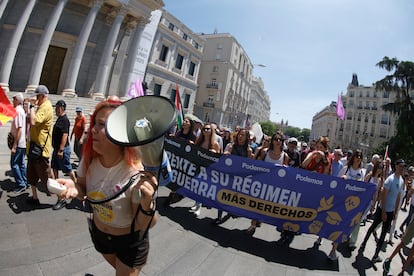 La protesta ha comenzado en las inmediaciones de la estación de Atocha, al comienzo del Paseo del Prado, y han terminado en la Puerta del Sol. En ese trayecto, la concentración ha pasado frente al Congreso de los Diputados, momento en el que las consignas que decenas de manifestantes coreaban al unísono se han centrado en el Gobierno y el jefe del Ejecutivo: “Pedro Sánchez, vete tú a la guerra”, o “Gobierno progresista, hipócrita y sionista”, han gritado decenas de personas, que portaban todo tipo de banderas y carteles.