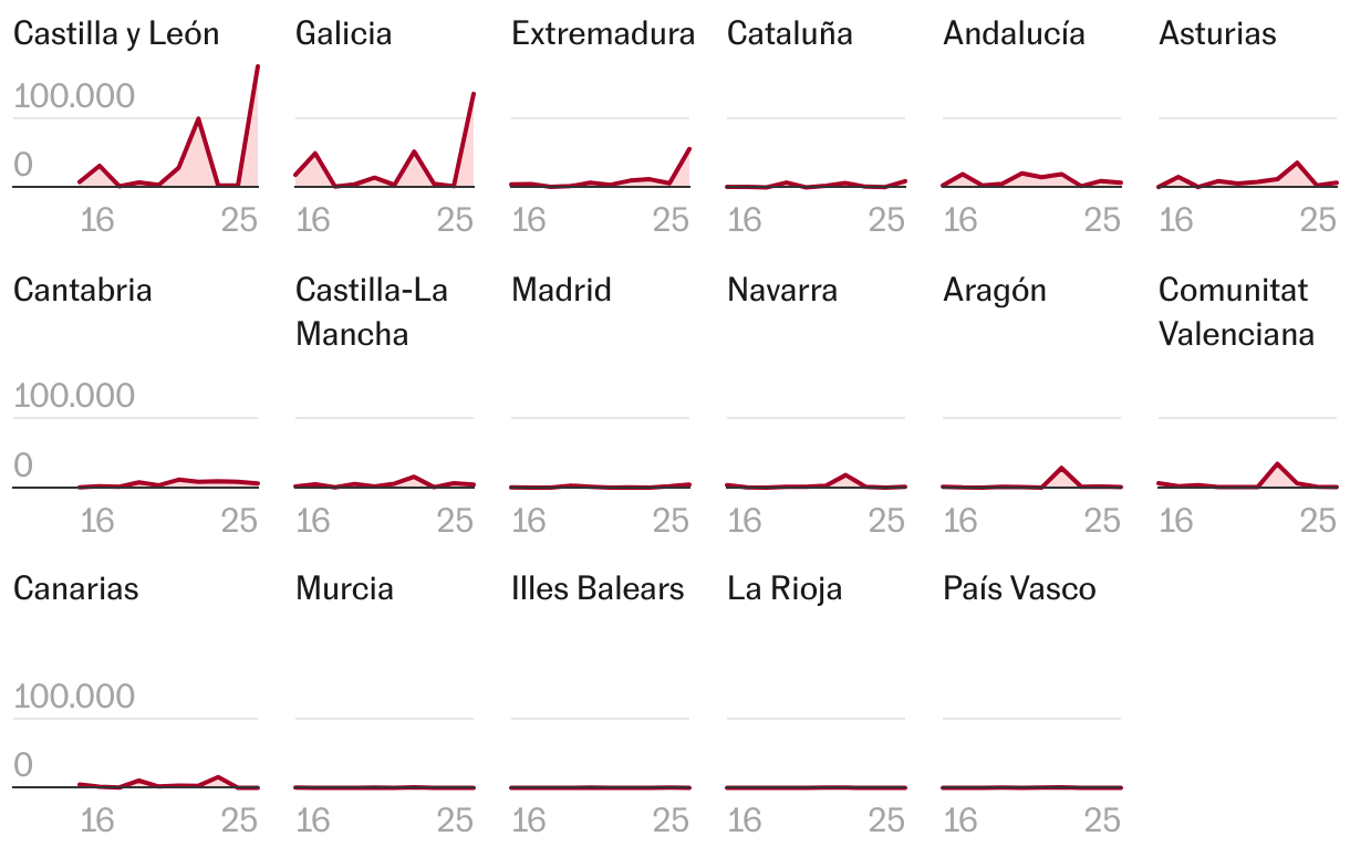 El grueso del área quemada no solo se ha registrado en un corto espacio temporal, también se concentra principalmente en dos comunidades autónomas: Galicia y Castilla y León. Estas dos regiones, que concentran más del 75% de la superficie quemada este año, también fueron las más afectadas en 2022.