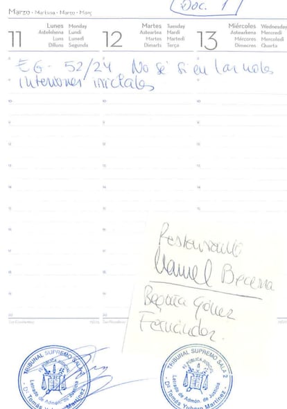 En la nota adhesiva, pegada en la página de la agenda de Rodríguez correspondiente a los días 11, 12 y 13 de marzo de 2024, la fiscal anotó de su puño y letra “restaurante Manuel Becerra” [una plaza de Madrid] y, debajo de una raya, el nombre de la esposa de Pedro Sánchez. La página de la agenda en la que aparece la nota está fechada antes de que se hubiera presentado la denuncia de Manos Limpias contra Gómez (8 de abril) y que luego acabaría en una apertura de diligencias por el juez Juan Carlos Peinado a finales de ese mes. Fuentes de la Fiscalía señalan que la fiscal solía anotar en adhesivos tareas pendientes en su labor cotidiana.